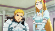 While the capital Re-Estize is surrounded by the Sorcerer Kingdom's forces, Climb, Renner, and Brain, having earlier visited the orphanage, are informed by the few remaining knights that Blue Roses is waiting for them after they return to the palace. To guarantee Renner's escape to safety, Climb and Brain discuss in secret about arranging a carriage outside of the palace. Before meeting with Blue Roses, Climb prepares water and a towel for Renner to wipe away her sweat before heading off with Brain to take a quick shower. Since the maids aren’t there, Climb has no choice but to help clean up and dress Renner.