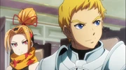 After a discussion between Renner and Lakyus begins, he is shocked when, all of a sudden, Gagaran and Tia launch a decisive combo attack repeatedly on their team leader. He goes to Renner's side, shielding and covering the princess from whatever harm the remaining Blue Roses members are plotting against Lakyus. He is threatened by Evileye to hold still and not make any foolish move on them until they successfully accomplish their scheme. which is to drug and cast [Charm Person] on Lakyus.