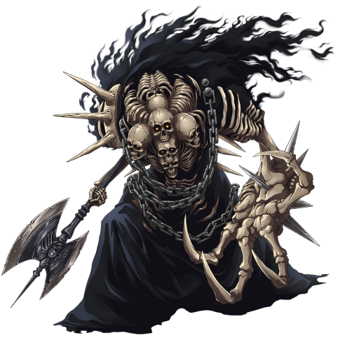 A hulking undead that seems to be a fusion of multiple skeletons. Its upper torso is comprised of several rib cages and six skull heads. On its right shoulder, it had a spiked ossified pauldron. Its upper limbs are asymmetrical as the right hand is skinny while the left is a massive four-fingered claw with a nail impaled at the center. The Corpse Guardian wears a tattered robe, that exposes his upper torso, while the bottom part is covered with multiple chains.