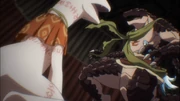Inevitably, the loss goes to the lizardmen when all the tribal leaders and strong warriors are slaughtered by Cocytus, ending with Crusch in becoming the de facto chieftain of the Lizardmen Alliance. Cocytus brings her to the Monument of Ruin, before Ainz Ooal Gown. She offers the official surrender of the lizardmen and fears that the lizardmen will be enslaved. Quite to the contrary, the Overlord assures her that he will ensure the prosperity of her race with Cocytus ruling in his stead. The female lizardman is offered a chance to have Zaryusu resurrected, in return, she would act as Ainz's eyes and ears for any plans of rebellion by dissidents.[4] Crusch accepted Ainz's offer and is later present during Zaryusu's resurrection.[5]