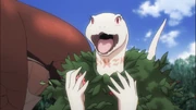 Crusch was present when her mate brought the protagonist, Slimeko, Aura, and Mare in their home along with the other lizardmen chieftains after training with the dark elves in preparation for a scouting mission to the isolated island. Just before the party from Sorcerer Kingdom was about to leave, Zaryusu Shasha requested permission to join the expedition to the shock of his peers. A few such as his brother advised against it due to Crusch's expecting to give birth to a child, but Crusch ultimately allowed her mate to go knowing his desire as a traveler to see new lands. She insisted that she would be alright in his absence and hoped that he would bring back a new heroic tale for their offspring.[12]