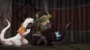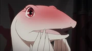 Crusch was part of the lizardmen delegation that accepted the invite to attend the New Year's banquet at Nazarick. At the Amphitheater, Crusch wearing her bush cloak was impressed by the glow sticks used by the general maids in attendance thinking it was like a summoning of the ancestors or a hallucination. After the lizardmen presented Momonga their gift, Crusch added that she would perform a dance for the occasion. The female lizardman was seen partaking in drinking some otoso, made from the drink provided by the lizardmen, and expressed some desire to bring some back to the village, though her husband Zaryusu tried to discourage her. She was present in witnessing the mock battle between Kyuko and Narberal Gamma against Shiro and praised that her village was lucky to have such strong warriors as allies.[18]