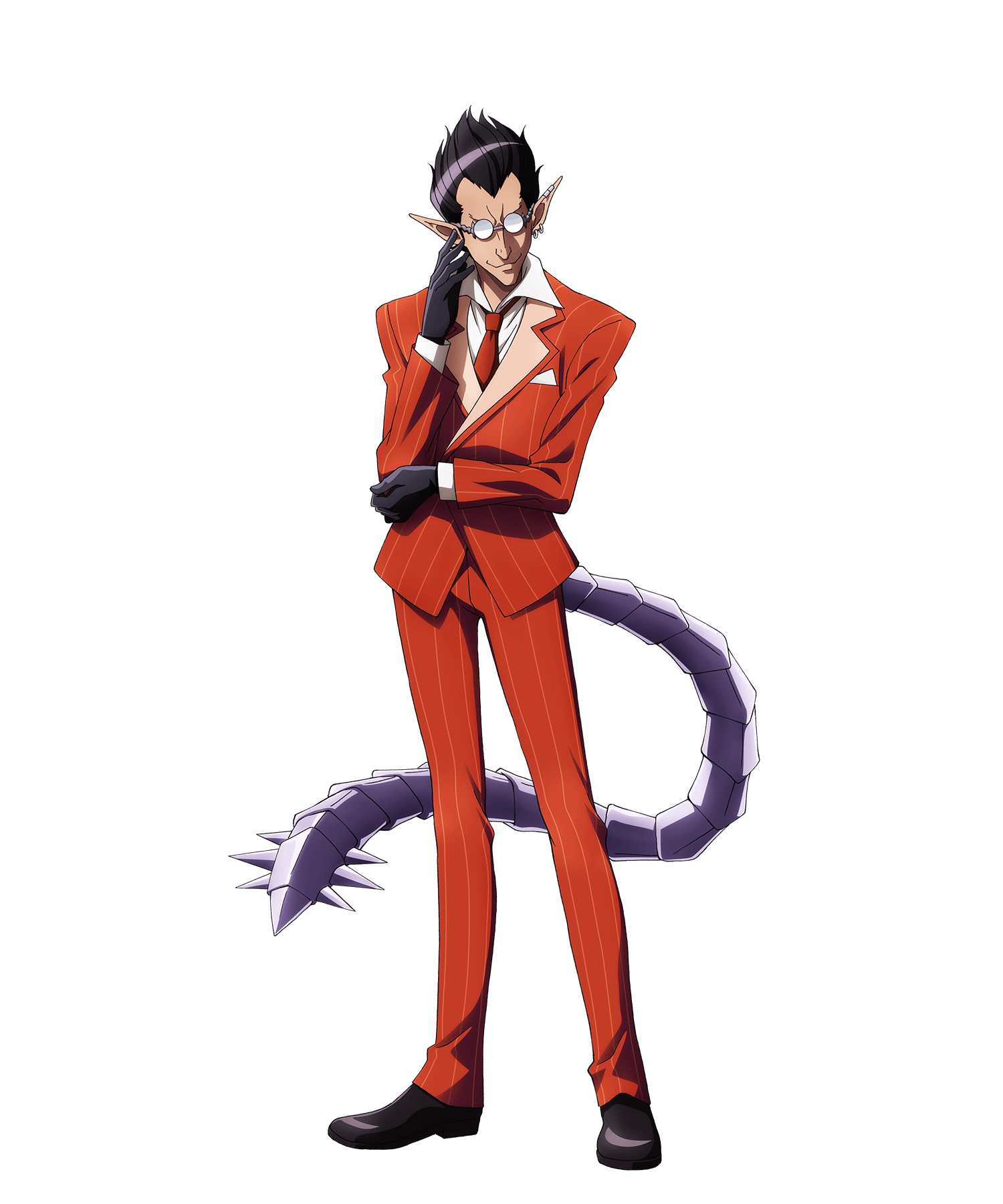 Demiurge is described to be a tall demon with dark skin and nicely combed black hair. Behind the round glasses are eyes so squinted that they are not normally visible. Wearing a British suit with a tie, he is dressed like a gentleman. Behind his back is a silver tail, covered with metal plates and six long spikes at the end. In his humanoid form, Demiurge's eyes lack eyeballs, instead, shining jewels with numerous small cuts take their place.
