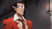 When he finally return back to Nazarick after doing his duties abroad, Demiurge respectfully greeted Ainz and offer him guidance on what appropriate food is best serve for their human guests. Shortly later, he and the other male Floor Guardians came together and then prepare to set off for a bath together. Seeing Albedo attempting to disrupt Ainz's time, he harshly chastises Albedo that she should probably learn how to rein her emotions in before he proceeded to the men's bath soon after. In the bath, he poke fun at Cocytus's exoskeleton body being always exposed as naked all the times much to the latter's displeasure. Learning from Cocytus that he can bathe in hot water, he recommends Cocytus should have suggested they take a hot bath together to promote circulation. After Demiurge finished rinsing himself off, he headed for the tub. Seeing that Cocytus is using his cold aura, he then decided to advise it to keep a distance away from him so that his hot water remains scalding in the bath. Demiurge tells Cocytus that he is not interested in a cold bath as he views a hot bath to be his interest of enjoyment. However, midway through their discussion during the men's bath, Albedo and Shalltear attempt to get in but are assaulted by the Lion Golems. As a result, Ainz and the male Floor Guardians prepare to help them out while wishing for a peaceful bath the next time they have another one again.[17]