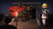 Soon after, he, along with the other Floor Guardians, threaten and intimidate the Lizardmen so that they become a part of Nazarick. He uses his magic to forcefully make Shasuryu Shasha and Zaryusu Shasha bow down in front of Ainz Ooal Gown, telling them to not resist. When Ainz is finally ready to listen to them, Demiurge permitted the two to raise their head before his master. Once that was over, Demiurge release his control over them before setting off with his fellow Floor Guardians and Ainz via [Gate].[15]