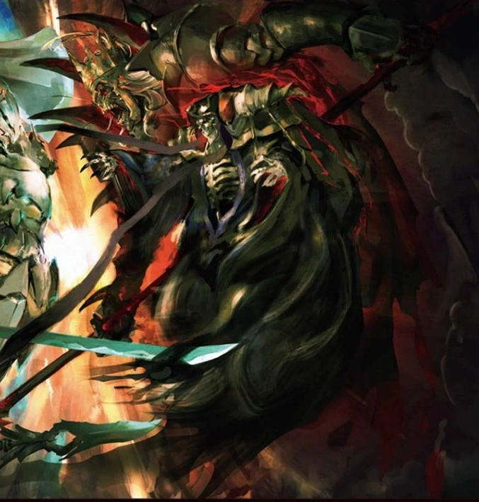 It is a type of undead that has a rusted crown sat on his dome and a blood-stained cape hung off his back. Adorning his full-plate armor were multiple scythe-like curved blades.