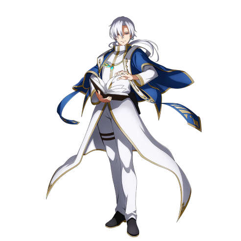 Enhela was a young man with short white hair and violet eyes. As a priest, he wears white and blue vestments.