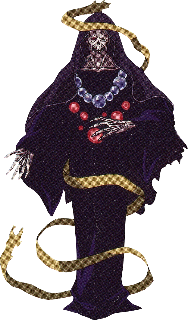 Iguva=41 was a hideous undead magic caster that reeks of death and decay. He wore an old and luxurious robe that covered his body of skin and bones.
