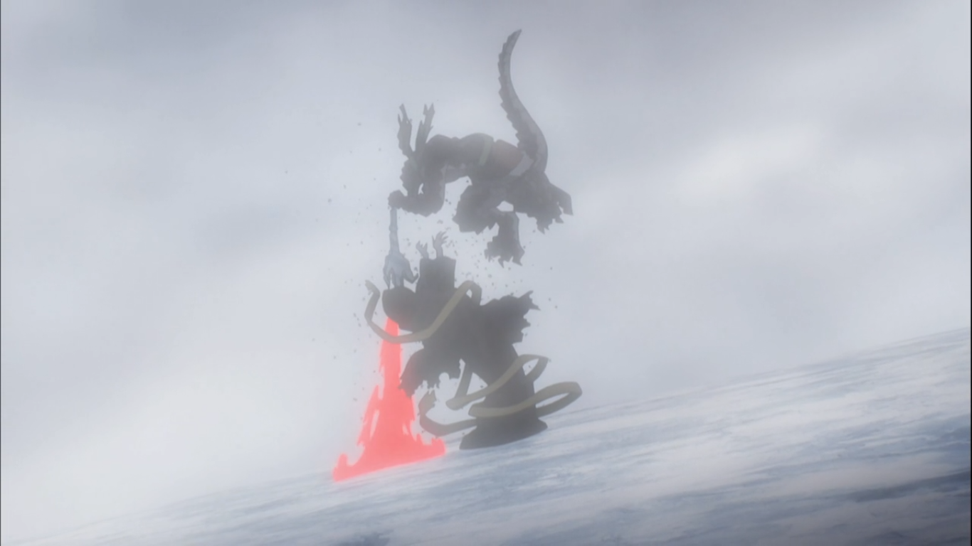 After a drawn-out battle, the lizardman, battered by the Lich's spells, engages one last time with his Frost Pain's special ability, creating a thick cold fog, and half-blindly striking through it. That strike finally puts his sword through Iguva=41's head, ending him once and for all. Before finally dying, Iguva=41 begs his creator, Ainz Ooal Gown for forgiveness in failing to defeat the lizardmen.[1]