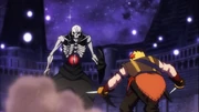 As they won't attack him, Ainz decides to make a move with [Touch of Undeath], a spell Arche has never heard of. Ainz calmly walks over to them, easily deflecting Imina's arrows; he instantly appears behind Imina to use his Touch, but Hekkeran pushes her out of the way to use a heavy combo of Martial Arts to strike Ainz. Thinking he got him, he stands bemused at Ainz with no damage, who grabs him by the face. Hekkeran then warns Imina he has immunity to slash and strike attacks, which Ainz corrects as any weaker level attacks don't leave damage on him; with Imina calling that a cheat. As the others debate this claim, they think he may have some weakness. Ainz then uses [Paralysis] on Hekkeran, and he thinks his [Touch of Undeath] may be overkill for them. Imina then directs her insults to Hekkeran who should have just abandoned her, but he didn't as he loves her; Ainz calls her out as distasteful for her insults. It is then Imina remembers and tries to bluff Ainz that if they don't return by a certain hour, Momon "The Strongest Man" will come for them. Ainz rebuffs this as he cannot save them from him.