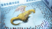 Come morning in the Imperial Palace, Jircniv has a council meeting and learns the Workers were all wiped out; compelling the Emperor to order proper countermeasures should they come into conflict. All while Fluder looks at him, and internally monologues how after six generations of service, he views Jircniv as the most extraordinary of the Emperors he has served in the past, even viewing him as a son. Jircniv calls him out of his blank stare, as he was lost in thought, as he depends on the mystical elder for wisdom in his reign. He asks Fluder if their scapegoat of a noble is ready for his part to begin; Fluder affirms this, as the people immediately in the room know the full truth. Glad to hear this, suddenly everyone is taken by surprise by the landing of a golden dragon with two Dark Elves on its back. When asked, Fluder admits he has never seen that breed of Dragon before. As the Dark Elves get off, Aura makes a proper announcement that the Emperor has sent intruders into Ainz's home, and as Ainz is incensed by this, if nobody takes responsibility then they have orders to destroy the whole Baharuth Empire, starting with the humans in the courtyard. Mare opens a hole in the ground swallowing everyone therein, shocking the Emperor and his guards on the balcony who witnessed the display of power.