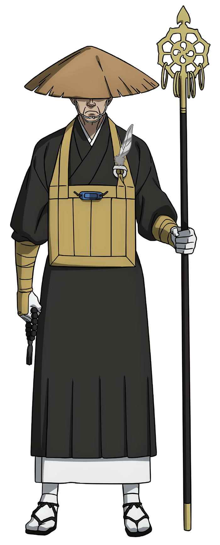Unkei is a bald man, with his head shaved due to his faith. He wears a strange battle robe called a kasaya, and a bizarre large straw hat called a fukaamigasa.