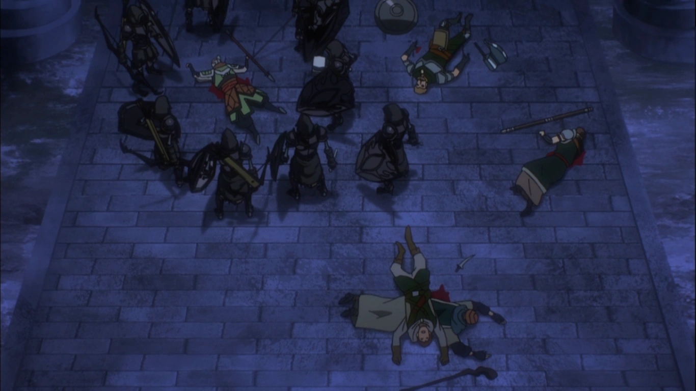 Roberdyck seeing the hopelessness of the situation orders Arche to use magic to fly away promising to buy her time to escape. Ainz interested in this decides to 'aid' Arche in this endeavor, opening the gate. Arche hesitant to escape without her comrades complies as the two reminded her that her sisters were waiting for her. Ainz is amused by the development as he expected them to show their disgusting selves but instead saw their deep bond as comrades. However, his admiration does not soothe his anger towards the workers who he perceives to be thieves that dare trespass unto the place he and his comrades built. He orders Shalltear Bloodfallen to chase after the girl and teach her the meaning of terror and to kill her with the deepest and sincerest mercy. The workers are stunned at the sentence Ainz condemns Arche to and together they attack him. Roberdyck reaches Ainz first and bears down his morningstar, but Ainz is unharmed so he follows up with a healing spell hoping it would do some damage. Unfortunately, the spell is useless as it hits Ainz's invisible barrier. Imina's arrows are likewise fruitless. The Overlord then appears behind the half-elf, Ainz had used [Time Stop], followed by [Touch of Undead] to incapacitate her.