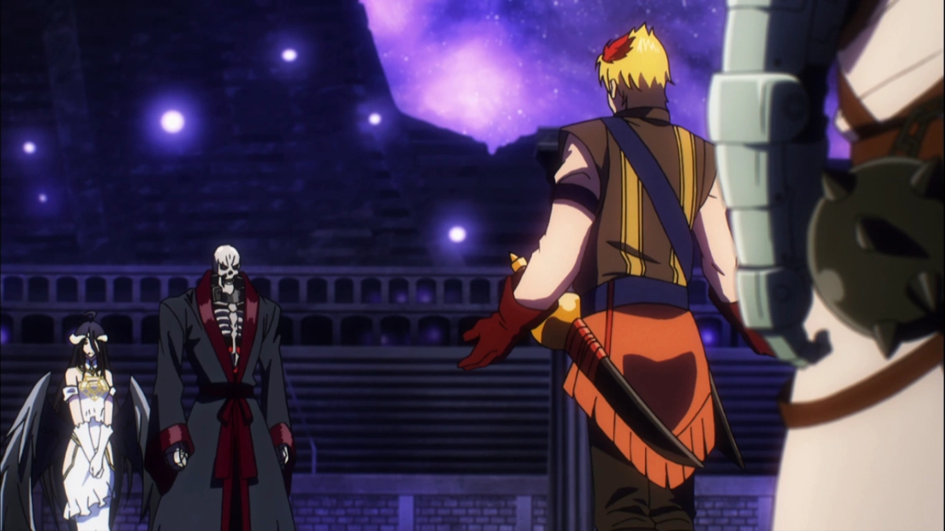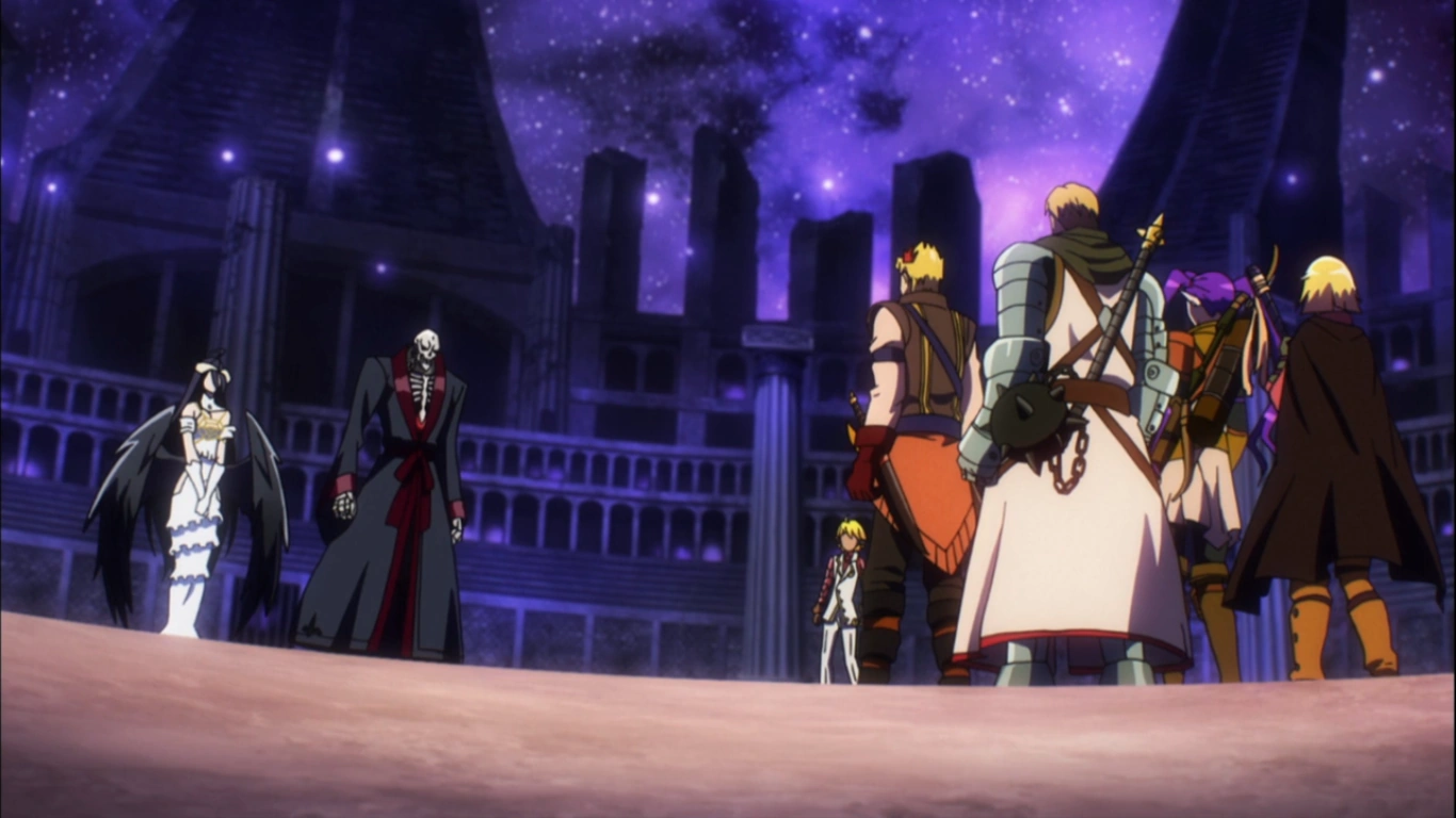 After stepping on a magic trap, Foresight found themselves in a large fighting ring similar to one in the Empire. Seeing the night sky, they thought they had been teleported outside and commented that they could be using flying magic to get away, not realizing that they were on the 6th of Nazarick. But before they could do anything else, they were interrupted by Aura Bella Fiora who acted as an announcer and introduced Ainz Ooal Gown, accompanied by Albedo, as their opponent.