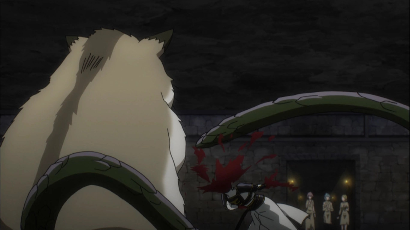 Ainz then went into a fit of rage, cursing them for lying to his face, but he was quickly quelled by the emotion dampener and assured Hekkeran that he understood their situation and couldn't hold such antics against them. He then engaged with the team of workers with a sword and shield, of course, none of their attacks had any effect on him. After a brief skirmish, Ainz stated that while he enjoyed a good sword fight, he found himself at a disadvantage against such a well-coordinated team. He then got rid of his weapons and challenged them to come and attack.